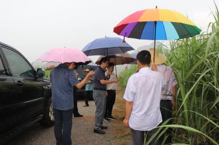 韋理事長(zhǎng)一行不顧行車旅途勞頓,先是直達(dá)貴港甘化樟木顯滕基地,冒雨實(shí)地了解相同甘蔗品種在同一地塊采用粉壟技術(shù)和非粉壟技術(shù)種植的生長(zhǎng)情況;途中還到蒙公鎮(zhèn)凌寺村大青屯察看采用寬窄行技術(shù)種植的甘蔗生長(zhǎng)情況。
