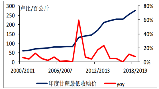 1998年為保護(hù)國(guó)內(nèi)甘蔗種植戶收益、抑制糖價(jià)大幅波動(dòng),印度政府開(kāi)始實(shí)施甘蔗收購(gòu)價(jià)政策。2018/2019榨季印度政府將甘蔗收購(gòu)價(jià)由255盧比/100公斤提高至275盧比/100公斤,高于印度甘蔗種植成本70%以上。受此影響,預(yù)計(jì)2018/2019榨季印度甘蔗種植面積顯著增加,甘蔗產(chǎn)量或?qū)⒃俣仍黾印?/p>